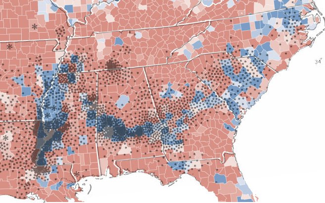 Andrew Sullivan at the Daily Dish points out this fascinating map that overlays areas of high cotton production with the county results from the 2008 election. Each black dot represents a location producing over 2000 bales of cotton in 1860, just before the Civil War.The link between these two maps is not causal, but correlational, and the correlation is African-Americans. Once they were the slaves on whom the cotton economy had to rely for harvesting. Despite an outward migration towards the Northern cities, their settlement pattern now still closely corresponds to that of those days.